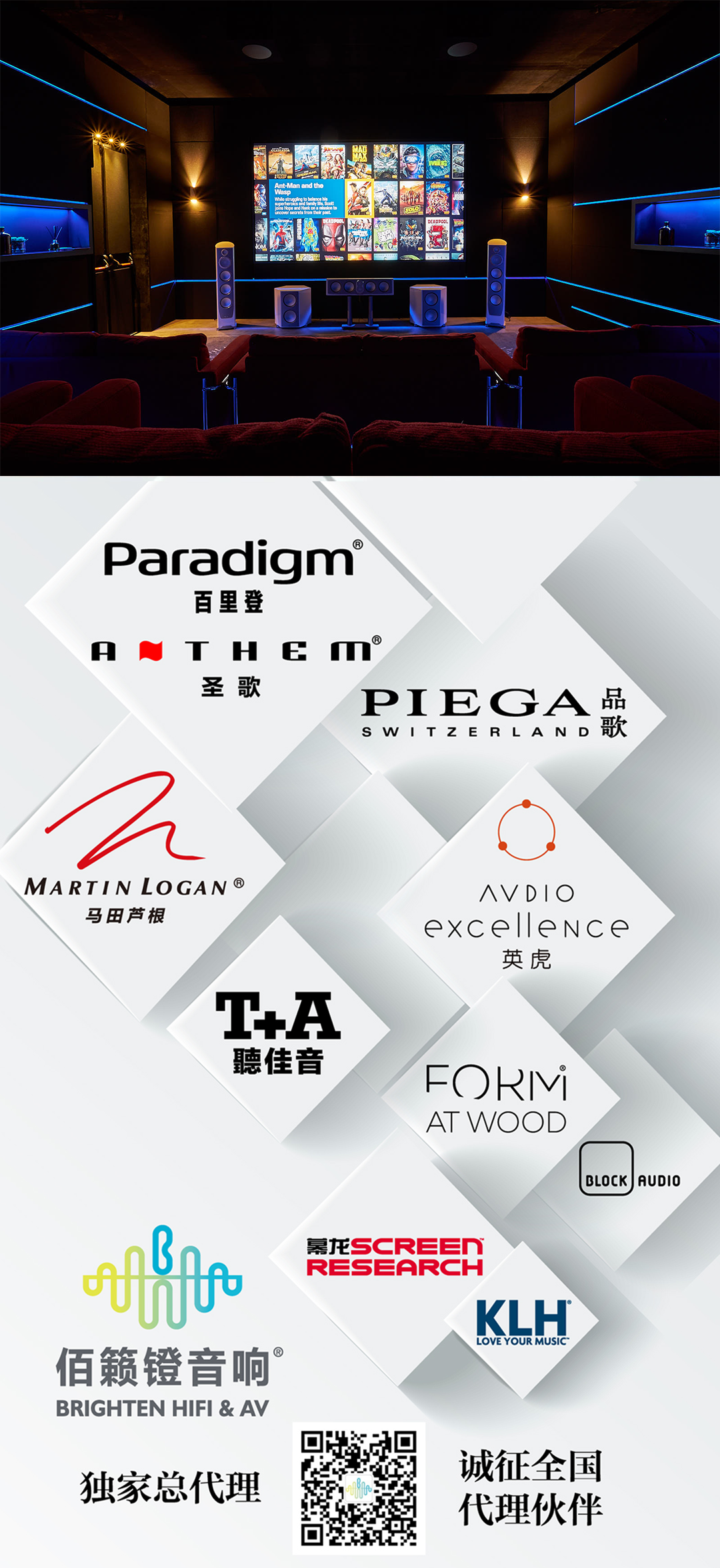 佰籁镫音响(中国)是由国内外业界资深人事共同创办,旨在代理、推广、销售、服务国内外知名影音品牌及其产品,努力推广“品质视听,服务相随”的经营理念,并积极创造“开心、诚心、尽心”的顾客体验。公司与众多国际知名音响、功放、高端投影幕布、智能等品牌签订了长期的中国地区独家总代理合作协议。总代理品牌有:拥有28,000平米自主研发、设计、生产功能的加拿大影音名品集团PML International旗下的三大影音品牌,分别是Paradigm(百里登)、Martinlogan(马田芦根)、Anthem(圣歌),瑞士国宝级音响品牌PIEGA(品歌)、德国Hi-End奢侈品牌T+A(聽ni佳音),世界知名声学品牌FORM AT WOOD(正音声学)、捷克大师级功放品牌BLOCKAUDIO、美国中古四杰之一的KLH、英国高端影院音响品牌Audio Excellence(英虎)、世界编织幕布大师品牌Screen Research(幕龙)等。