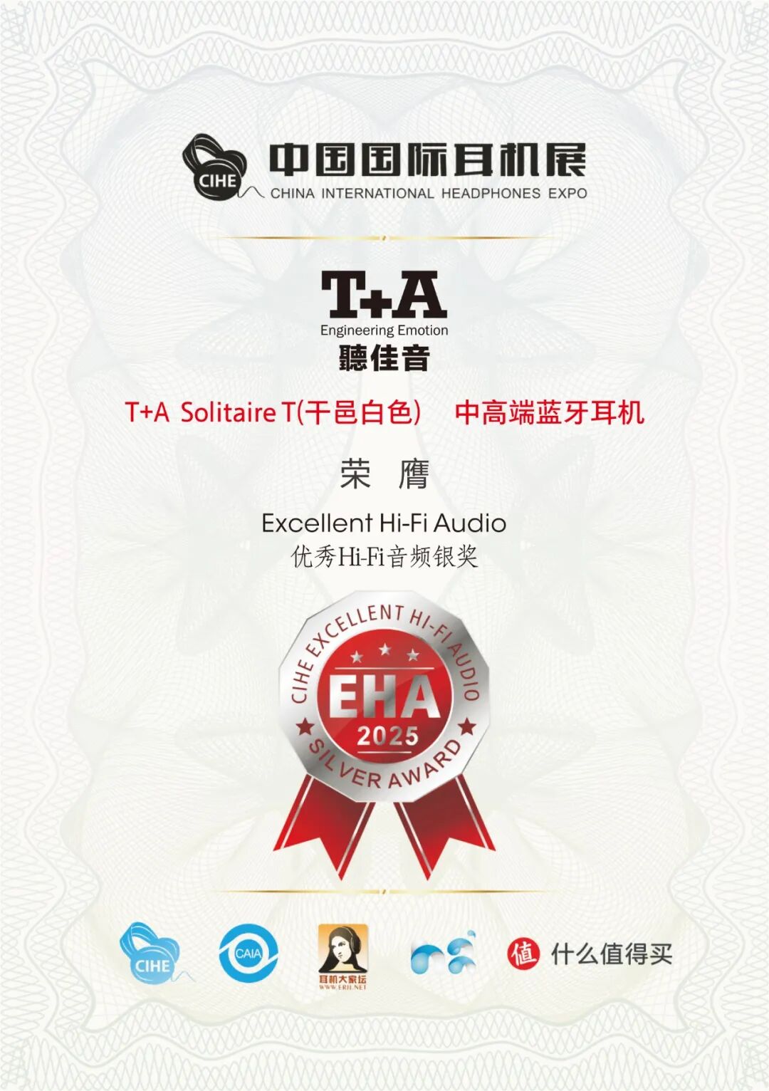 我们很高兴的宣布,来自德国最大Hi-End厂牌T+A「聽佳音」全新Solitaire T(干邑白)荣获2025优秀音频产品EHA大奖!