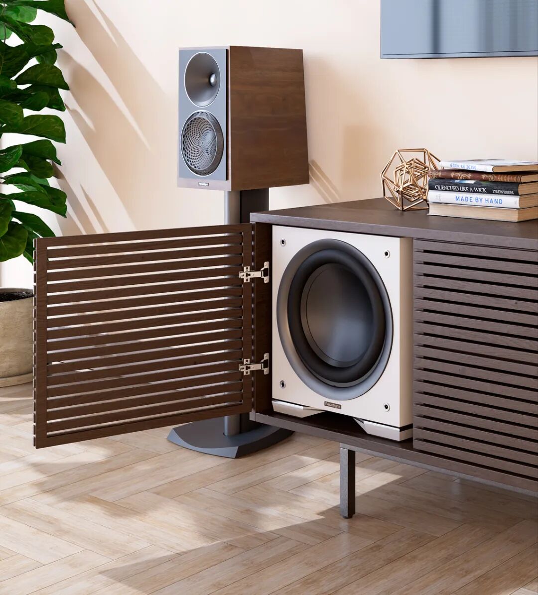 Paradigm Defiance S系列低音炮采用创新的全密闭设计,实现革命性的"隐藏安装"方案。该技术使低音炮可完美融入定制书架,独立柜体或入墙,在提供安装灵活性的同时,确保声音性能零妥协。